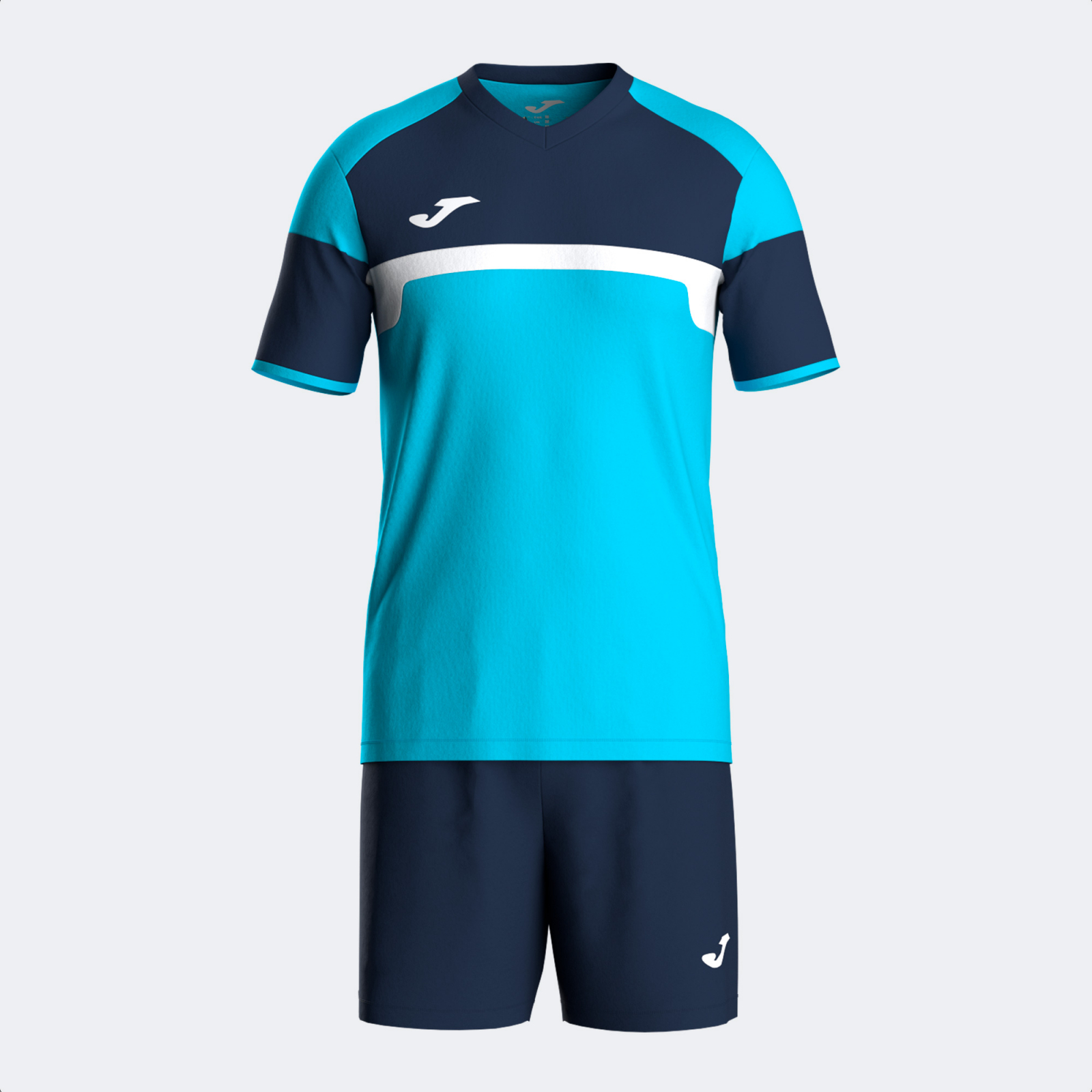Set sportiv pentru bărbați. Model pentru antrenament și joc de fotbal. Acest set este alcătuit dintr-o cămașă cu mânecă scurtă și pantaloni scurți. Este ușor, confortabil, respirabil și oferă o excelentă libertate de mișcare.